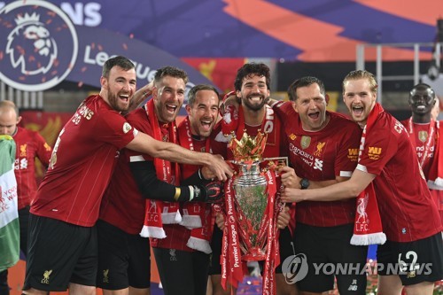 Liverpool goalkeepers Andy Lonergan (L), Adrian (2L), Alisson Becker (C) and Caoimhin Kelleher (R) pose with their coaches John Achterberg (2R), first-team goalkeeping coach and Jack Robinson (3L), first-team assistant goalkeeping coach, celebrate the Premier League title following the English Premier League soccer match between Liverpool FC and Chelsea FC in Liverpool, Britain, 22 July 2020. EPA/Paul Ellis/NMC/Pool EDITORIAL USE ONLY. No use with unauthorized audio, video, data, fixture lists, club/league logos or 'live' services. Online in-match use limited to 120 images, no video emulation. No use in betting, games or single club/league/player publications.