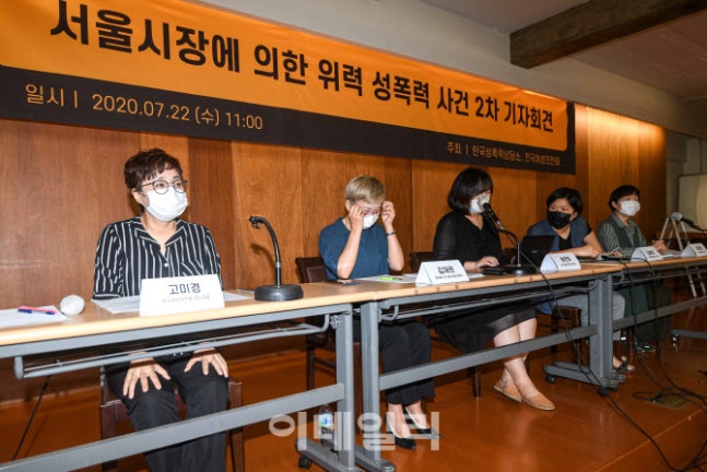 [이데일리 이영훈 기자] 고미경 한국여성의전화 상임대표(왼쪽부터), 김재련 법무법인 온-세상 대표변호사, 송란희 한국여성의전화 사무처장, 김혜정 한국성폭력상담소 부소장, 이미경 한국성폭력상담소 소장이 22일 오전 서울 모처 한 기자회견장에서 열린 '서울시장에 의한 위력 성폭력 사건 2차 기자회견'에 참석하고 있다.
