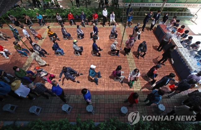 (대구=연합뉴스) 김현태 기자 = 16일 대구 달서구 노인종합복지관에서 열린 초복 맞이 삼계탕 나눔 행사에서 관내 어르신들이 개별포장된 삼계탕과 과일 등을 받기 위해 거리 두기를 하며 기다리고 있다. 달서구 노인종합복지관은 이날 250인분의 삼계탕 보양 도시락을 준비했다. 2020.7.16