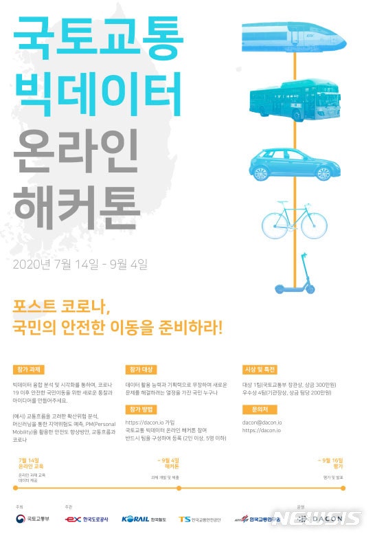 올해 해커톤은 신종 코로나 바이러스 감염증(코로나19) 데이터와 대중교통, 고속도로, 유동인구 정보 등 국토교통 데이터를 빅데이터 기술을 기반으로 융합 분석해 국민 생활의 기본이 되는 안전한 이동을 위한 과학적인 통찰과 개선방안을 도출하는 것을 목표로 한다.