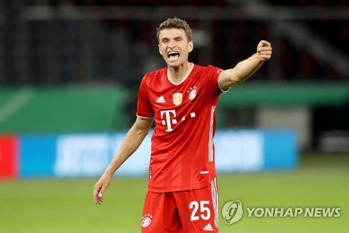 Thomas Mueller of Bayern Munich reacts during the DFB Cup final match between Bayer 04 Leverkusen and FC Bayern Munich at Olympiastadion in Berlin, Germany, 04 July 2020. EPA/ALEXANDER HASSENSTEIN / POOL The DFB regulations prohibit any use of photographs as image sequences and/or quasi-video.