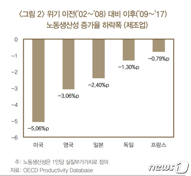 미국과 일본, 독일, 프랑스, 영국 이탈리아 등 주요국가의 전(全)산업 노동생산성 증가율은 글로벌 금융위기 이전(2002~2008년)보다 이후(2009~2017년) 0.54%포인트 떨어졌다. 이 기간동안 주요국가의 제조업 노동생산성 증가율은 2.03% 하락했다.
