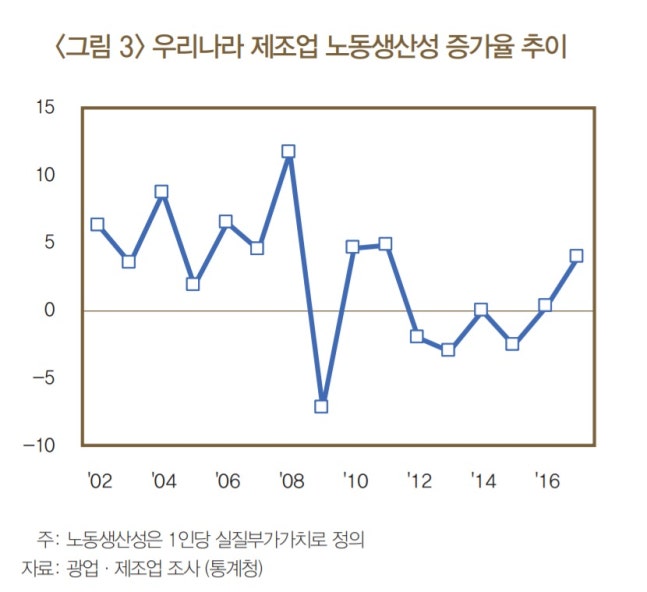 한은은 우리나라의 제조업 노동생산성 증가율이 둔화된 이유에 대해 "거시 요인을 보면 해외 경기 둔화에 의한 수요 감소 및 불확실성 확대가 수출과 투자에 부정적 영향을 미쳤고, 이는 자본장비율 하락 등으로 이어져 노동생산성 둔화에 영향을 준 것으로 보인다"고 했다.