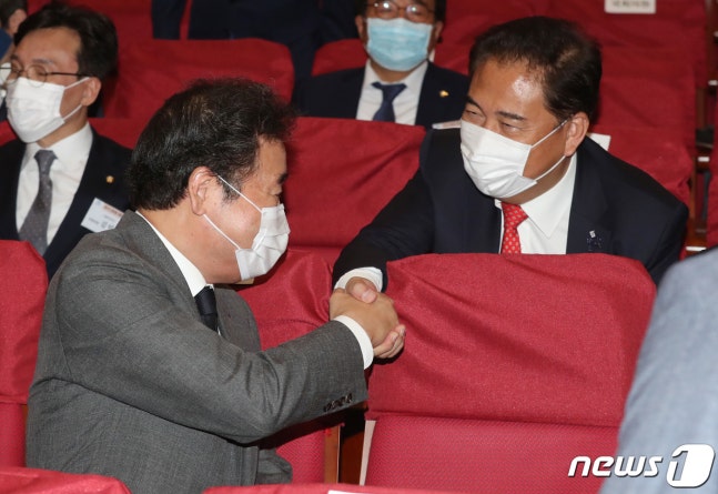 (서울=뉴스1) 박세연 기자 = 이낙연 더불어민주당 코로나19국난극복위원장(왼쪽)과 박진 미래통합당 의원이 24일 오전 서울 여의도 국회 의원회관에서 열린 제21대 국회 개원 국회조찬기도회에 참석해 인사를 나누고 있다. 2020.6.24/뉴스1