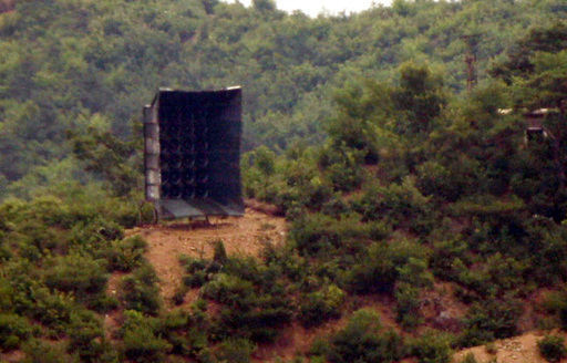| 지난 23일 인천시 강화군 평화전망대에서 바라본 북한 황해북도 개풍군에 대남 확성기가 설치돼 있다. 연합뉴스 |