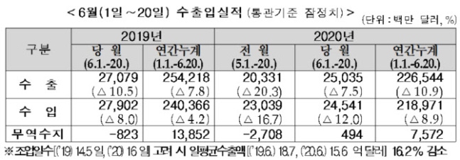 - 6월(1~20일) 수출 7.5%↓…감소율 한자릿수로