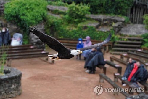 An eagle during ''Le Bal des Fantomes'' show of the Puy du Fou theme park in Les Epesses, near Nantes, Vendee region, France, 11 June 2020. Puy du Fou is the first entertainment park wich welcomes its first visitors after it was decided that French tourist sites and theme parks in the green zones will reopen to the public from 02 June. EPA/EDDY LEMAISTRE