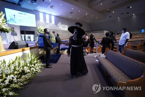Mourners pass by the casket of George Floyd during a public visitation for Floyd at the Fountain of Praise church, in Houston, Texas, USA, 08 June 2020. A bystander's video posted online on 25 May, appeared to show George Floyd, 46, pleading with arresting officers that he couldn't breathe as an officer knelt on his neck. The unarmed Black man later died in police custody and all four officers involved in the arrest have been charged and arrested. EPA/David J. Phillip / POOL
