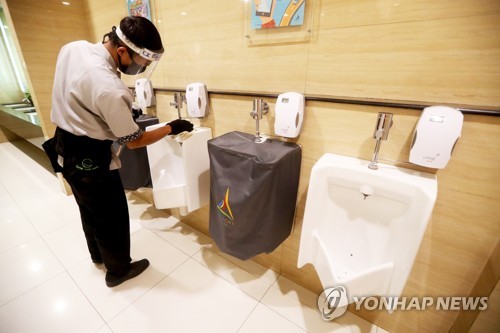 An employee cleans public toilets amid an easing of coronavirus emergency measures, at Margo City Shopping Mall in Depok, Indonesia, 09 June 2020. The Indonesian government enforced a new set of norms known as 'new normal' in several low-risk provinces starting early June. EPA/BAGUS INDAHONO