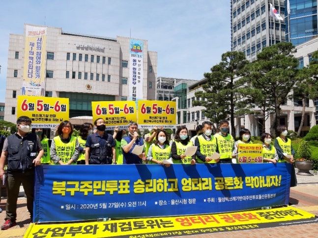 ‘월성 핵쓰레기장 반대 주민투표 울산운동본부’는 지난달 27일 울산시청 앞에서 기자회견을 열고, 경북 월성원전 사용후핵연료 추가시설 건설과 관련해 민간 주도의 울산 북구 주민 찬반투표 계획을 밝혔다. 정부와 한국수력원자력(한수원)이 경북 경주시 월성원전에 사용후핵연료 임시저장시설(맥스터)을 추가 건설하려 하자, 5일 경주시에 이웃한 울산 북구에서 민간 주도로 주민 찬반투표가 시작됐다.‘월성원전 사용후핵연료 저장시설 추가건설 찬반 울산 북구 주민투표관리위원회’는 “이날 오전 6시부터 울산 북구 지역 34개 투표소에서 월성원전 사용후핵연료 저장시설 추가건설 찬반 주민투표가 시작됐다”고 밝혔다. 이 투표는 울산지역 98개 시민·사회·노동단체가 참여하는 ‘월성 핵쓰레기장 반대 주민투표 울산운동본부’와 주민투표관리위가 민간 주도로 추진하는 것이다. 18살 이상 울산 북구 주민 17만5138명을 대상으로 6일 저녁 8시까지 진행한다.