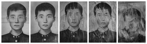 | 노순택의 ‘망각기계’. 작가는 5·18민주화운동 사망자들이 묻힌 광주 옛 묘역의 영정사진들을 15년 동안 시간적 간격을 두고 촬영했다. 비바람에 바래고 훼손된 영정사진들을 통해, 역사적 비극을 기념하는 과정에서 무엇이 잊혀지고 또 기억되는지를 관객에게 묻는다. |
