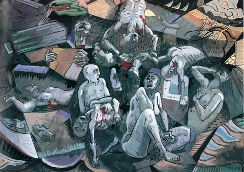 | 강연균의 ‘하늘과 땅 사이 1’. 작가의 5·18 연작 중 초기작품. 잔혹한 군사압제하의 공포와 번민, 슬픔으로 고통받는 인간상을 보여준다. |