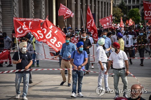 People attend a rally staged by COBAS trade union to protest against the economic policy at central, regional and local level in Milan, Italy, 06 June 2020. The rally was organized to express the 'malaise' for the heavy economic crisis due to the Covid19 emergency that caused a lockdown. EPA/MATTEO CORNER