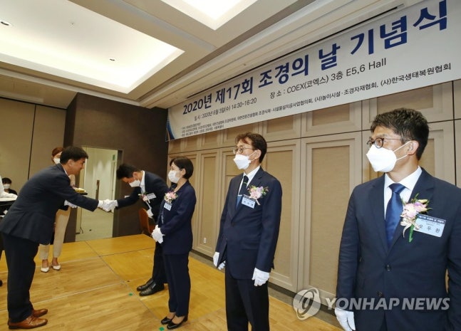 (서울=연합뉴스) 이재희 기자 = 3일 오후 서울 강남구 코엑스에서 열린 '제17회 조경의 날 기념식'에서 권혁진 국토교통부 도시정책관이 국토교통부 장관 표창자들에게 표창장을 수여하고 있다. 2020.6.3