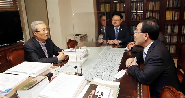 미래통합당 주호영(오른쪽) 원내대표와 김종인(왼쪽) 비대위원장 내정자가 22일 오후 서울 종로구에 위치한 김 내정자의 사무실에서 만나 대화하고 있다. 연합뉴스