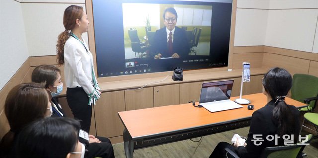 20일 부산 남구 동명대 산학협력단 취업지원센터에서 취업준비생들이 비대면 인공지능(AI) 모의면접 프로그램 ‘셀프뷰(self view)’로 면접을 보고 있다. AI 모의면접은 시간과 장소에 관계없이 휴대전화 또는 PC로 가능해 학생들에게 인기가 높다.