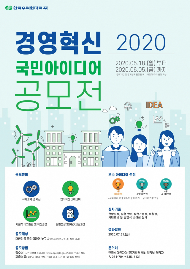 한국수력원자력(사장 정재훈)은 국민과 함께하는 경영혁신을 위해 ʻ2020 한수원 경영혁신 국민 아이디어 공모전ʼ을 시행하고 있다고 21일 밝혔다.