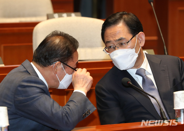 [서울=뉴시스] 고승민 기자 = 미래통합당 주호영 원내대표와 이종배 정책위의장이 20일 서울 여의도 국회에서 열린 20대 국회 마지막 의원총회에더 대화를 하고 있다. 2020.05.20.