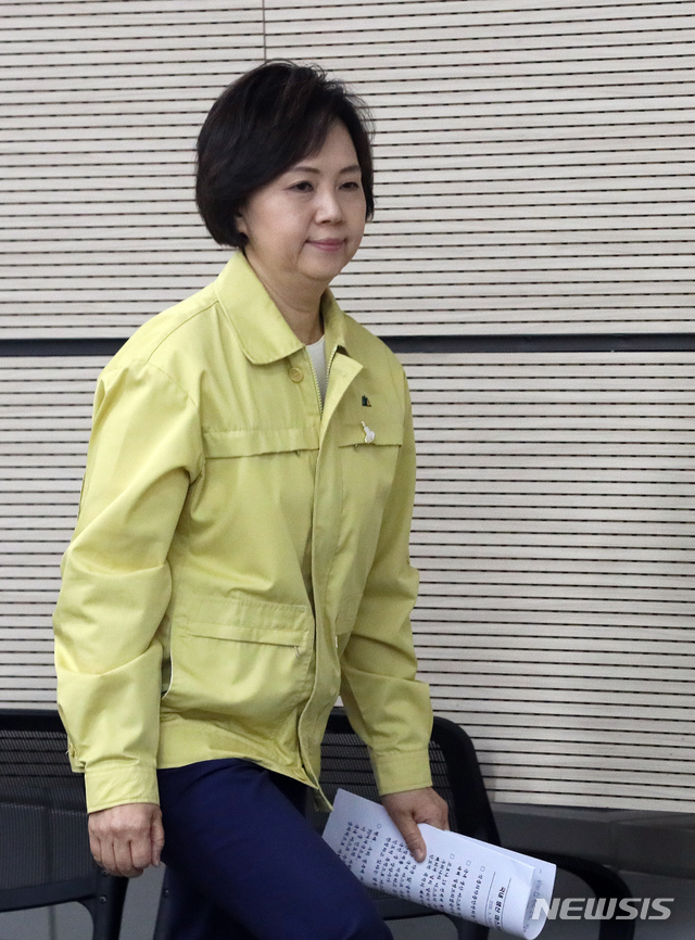 [세종=뉴시스]강종민 기자 = 이의경 식품의약품안전처장이 7일 오전 정부세종청사에서 국내 생산 마스크 인도적 목적 해외지원 확대 브리핑을 위해 단상에 오르고 있다. 2020.05.07.