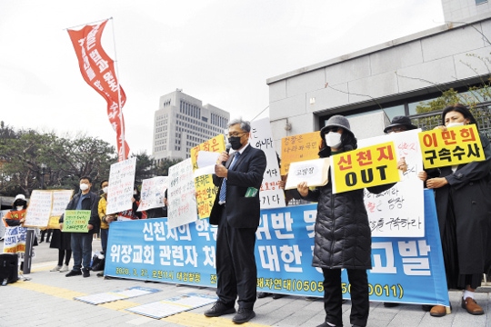 전국신천지피해자연대 관계자들이 지난 3월 27일 서울 서초구 대검찰청 앞에서 학원법을 위반한 신천지 위장교회 관련자 처벌을 요구하는 기자회견을 열고 있다. 국민일보DB