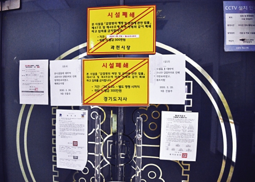 경기도 과천 신천지 본부 입구가 30일 ‘시설폐쇄’ 경고장과 함께 굳게 닫혀있는 모습. 과천=강민석 선임기자