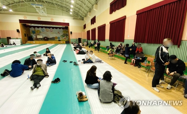 (고성=연합뉴스) 박영서 기자 = 1일 오후 강원 고성군 토성면 산불 대피소가 마련된 천진초등학교에 주민들이 대피해 있다. 2020.5.1
