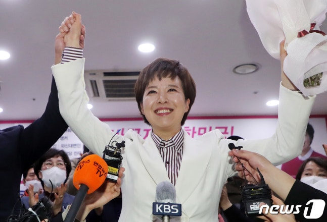 (성남=뉴스1) 조태형 기자 = 김은혜 미래통합당 성남 분당구갑 후보가 16일 오전 경기도 성남시 분당구 선거 사무소에서 21대 국회의원 선거 당선이 확실해지자 지지자들의 환호를 받으며 기뻐하고 있다. 2020.4.16/뉴스1