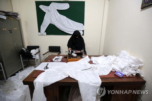 A worker stitch protective suit at a small factory amid the ongoing coronavirus COVID-19 pandemic in Peshawar, Pakistan, 13 April 2020. Countries around the world are taking increased measures to stem the widespread of the SARS-CoV-2 coronavirus which causes the COVID-19 disease. EPA/ARSHAD ARBAB