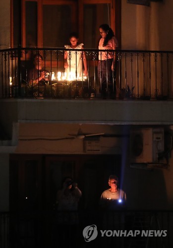 Indian light the candles and earth lamps in a residential complex near New Delhi, India 05 April 2020. Indian prime minister Narendra Modi has urged Indian citizens to give out a symbolic message of unity on the fight against Coronavirus by lighting a candle, diya (earthen lamp) or by flashing a torchlight at 9 pm, for nine minutes on 05 April. The prime minister has asked people to stay indoors during this event and to maintain social distancing. India is under a nationwide 21-day lockdown since 24 March 2020 to stem the widespread of the SARS-CoV-2 coronavirus which causes the COVID-19 disease. EPA/HARISH TYAGI