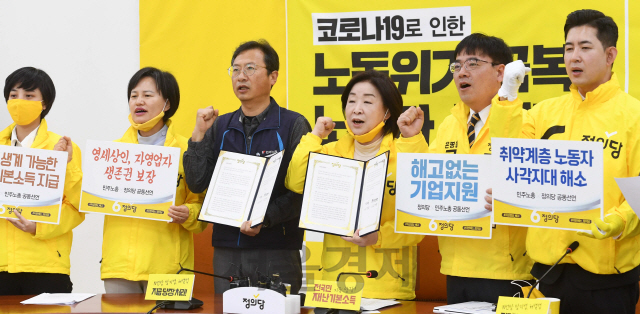 [서울경제] 심상정 정의당 대표와 김명환 민주노총 위원장이 6일 오전 서울 여의도 국회에서 열린 '코로나19 노동위기 극복 정의당-민주노총 공동선언'에서 구호를 외치고 있다./권욱기자 2020.4.6