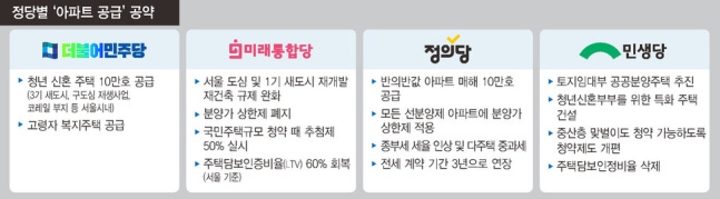 각 정당은 턱없이 오른 가격에 아우성치는 수요자들을 위해 여러 공약을 내놨다. 과거 ‘뉴타운’을 연상하게 하는 재개발 공약부터 투기 수요 억제를 위한 부동산 관련 세제 개편 공약, 무주택자와 청년들을 위한 임대주택 확대 공약까지 정당별로 정책 차이가 뚜렷하다.