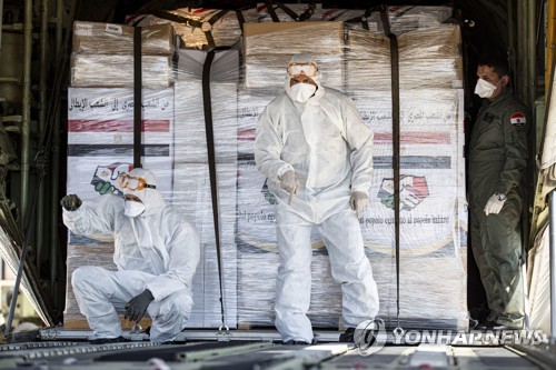 Airport staff unloads medical aid for Italy arrived with 3 flights, 1 from Ukraine and 2 from Egypt to Pratica di Mare, near Rome, Italy, 4 April 2020. Countries around the world are taking increased measures to stem the widespread of the SARS-CoV-2 coronavirus which causes the COVID-19 disease. EPA/MASSIMO PERCOSSI