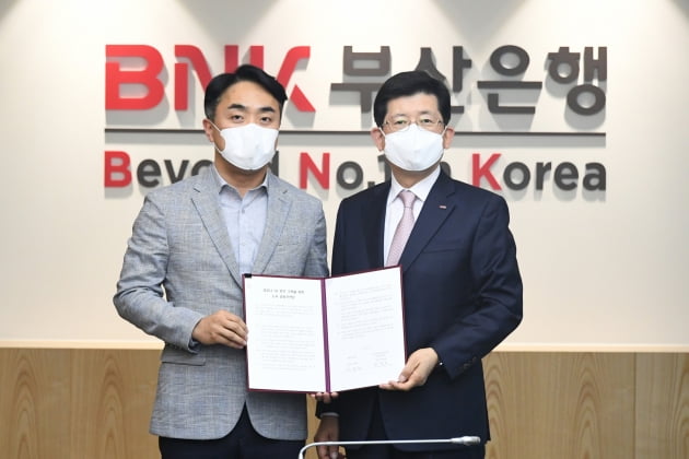 BNK부산은행 노사는 지난 1일 코로나19로 어려움을 겪는 지역경제를 신속히 지원하고 금융부문의 위기를 함께 이겨내기 위한 ‘노사공동선언문’을 발표했다.오른쪽부터 BNK부산은행 빈대인 은행장, 부산은행 노동조합 권희원 위원장.부산은행 제공.