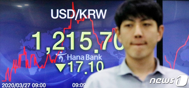 (서울=뉴스1) 안은나 기자 = 원·달러 환율이 1210원대로 급락한 27일 오전 서울 중구 하나은행 딜링룸 전광판에 원·달러 환율이 전 거래일보다 17.1원 떨어진 1215.7원을 나타내고 있다. 2020.3.27/뉴스1