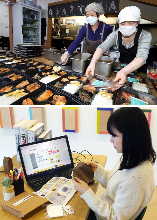 국내 주요 기업들이 신종 코로나바이러스 감염증(코로나19)으로 피해를 입거나 지원 사각지대에 놓인 사람들을 돕기 위해 나섰다. KT는 매출이 떨어진 음식점을 찾아 도시락을 만들어 직원들에게 판매하고(위 사진), CJ올리브영 직원들은 재택근무 중에도 면 마스크를 직접 만들어 26일 서울시립 십대여성건강센터에 전달했다. 각 사 제공코로나19로 직간접적인 피해를 입고 있는 소상공인을 돕기 위해 국내 주요 기업들이 팔을 걷어붙였다. 각 기업도 코로나19 사태로 공장이 멈추고 매출이 급락하는 ‘비상경영’ 상황이지만 국가적 위기 상황에서 사회적 책임을 다하겠다고 나선 것이다.