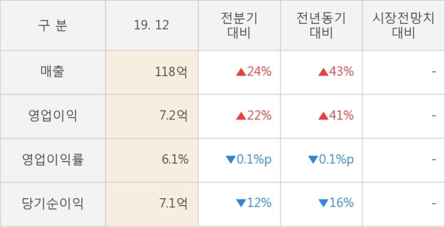 ◆ 작년 4Q 매출액 118억(+43%) 영업이익 7.2억(+41%)