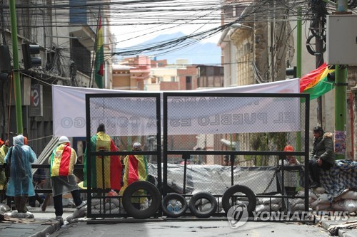 Bolivians guard one of the blocked accesses to the Murillo Square, in La Paz, Bolivia, 11 November 2019. The Bolivian Police will resume control of the streets of the cities and regions most affected by the violence, following the resignation of their general commander, Yuri Calderon. 'In the morning before the General Staff, the commander has resigned and stepped aside,' said Police Communication Director Rudy Uria at a press conference at the doors of the General Police Command in Peace. Bolivian President Evo Morales confirmed his resignation after almost 14 years in power on 10 November. EPA/Martin Alipaz