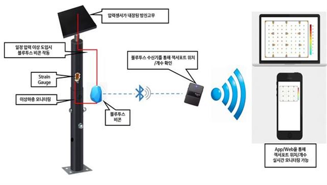 압력센서가 내장된 방진고무 등을 통해 일정수준 이상의 압력이 감지되면 블루투스 비콘이 작동, 휴대폰 앱으로 이상 여부를 알려주는 방식이다.