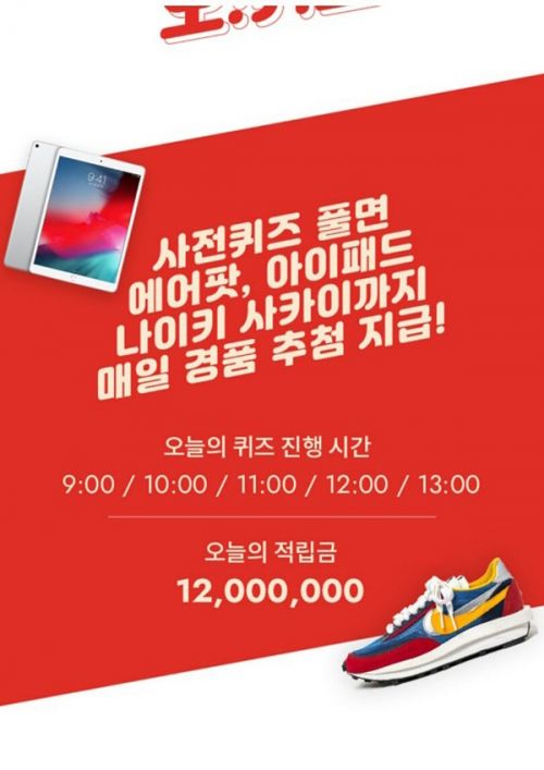 오퀴즈 사전퀴즈를 풀면 에어팟, 아이패드, 사카이 등 경품에 자동 응모가 되며 매일 중복 참여가 가능하다.