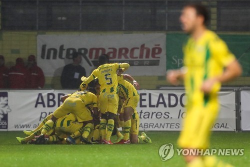 Tondela players celebrate during the Portoguese First League soccer match between Tondela and Sporting at Joao Cardoso Stadium, in Tondela, Portugal, 03 November 2019. EPA/PAULO NOVAIS