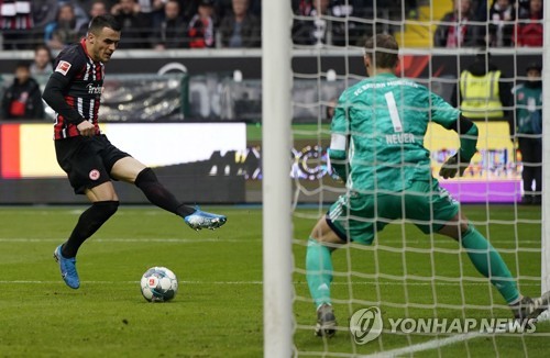 Frankfurt's Filip Kostic (L) scores the opening goal during the German Bundesliga soccer match between Eintracht Frankfurt and FC Bayern Munich in Frankfurt, Germany, 02 November 2019. EPA/RONALD WITTEK CONDITIONS - ATTENTION: The DFL regulations prohibit any use of photographs as image sequences and/or quasi-video.
