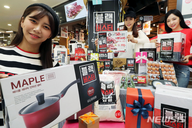 【서울=뉴시스】홍효식 기자 = 31일 오전 서울 강서구 홈플러스 강서점에서 모델들이 국내 소비자 맞춤형 대규모 할인 행사인 '블랙버스터' 개최를 알리며 세일 품목들을 선보이고 있다. 2019.10.31.