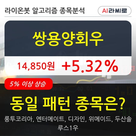 쌍용양회우이 시각 거래소에서 쌍용양회우 이외에도 룽투코리아(6.19%), 엔터메이트(5.0%), 디자인(6.54%), 위메이드(7.53%), 두산솔루스1우(5.23%) 등이 상승세를 보이고 있다.