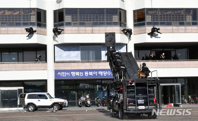 【부산=뉴시스】 하경민 기자 = 한·아세안 특별정상회의 경찰 경호경비단이 열린 30일 오후 부산 해운대구 수영만 요트경기장에서 대테러 시범에 나선 경찰특공대가 인질구출작전을 펼치고 있다.