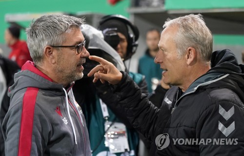 Freiburg's head coach Christian Streich (R) and Union's head coach Urs Fischer (L) chat before the German DFB Cup second round soccer match between SC Freiburg and 1. FC Union Berlin in Freiburg, Germany, 29 October 2019. EPA/Ronald Wittek CONDITIONS - ATTENTION: The DFB regulations prohibit any use of photographs as image sequences and/or quasi-video.