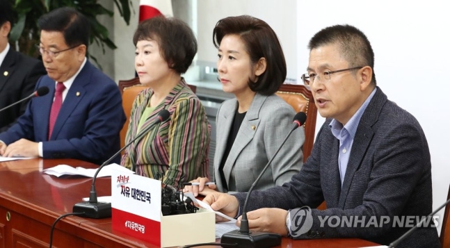 (서울=연합뉴스) 김주형 기자 = 자유한국당 황교안 대표(오른쪽)가 28일 오전 국회에서 열린 최고위원회의에서 발언하고 있다. 2019.10.28