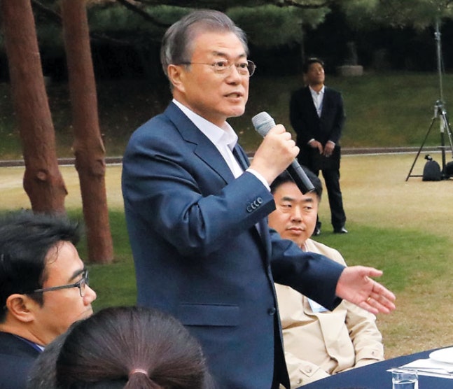 문재인 대통령이 25일 오후 청와대 녹지원에서 열린 출입기자단 초청 간담회에서 인사말을 하고 있다. 문 대통령은 북한의 금강산 관광 시설 철거 요구에 대해 "남북 관계를 훼손할 수 있다"고 했다. /연합뉴스