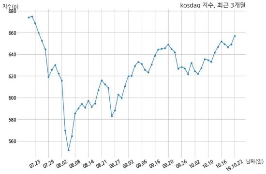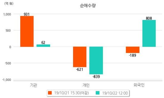 22일 오전 12시 코스닥(656.93p, +7.75p, +1.19%)은 외국인 매수가 늘면서 상승세를 보이고 있다. 투자자별 동향을 살펴보면 기관은 839억원 순매도했으며, 외국인은 808억원 순매수했다. 개인도 62억원 순매수하고 있다.