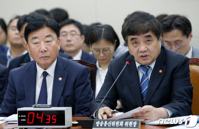 한상혁 방송통신위원회 위원장이 21일 서울 여의도 국회 과학기술정보방송통신위원회 회의실에서 열린 방송통신위원회, 원자력안전위원회 등에 대한 종합감사에서 의원 질의에 답하고 있다. 2019.10.21/뉴스1 © News1 안은나 기자