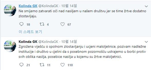 콜린다 그라바르 키타로비치 크로아티아 대통령 트위터 캡처논란이 거세지자 대통령도 입을 열었다. 크로아티아 첫 여성 대통령인 콜린다 그라바르 키타로비치는 트위터에 글을 써 사법부를 질타했다. 그는 “우리는 폭력에 눈을 감아서는 안 된다”며 “그것은 피해자들을 더 욕보이게 하는 행위”라고 지적했다. 그러면서 이번 사건에 대한 재검토가 이뤄져야 한다고 강력하게 주문했다.